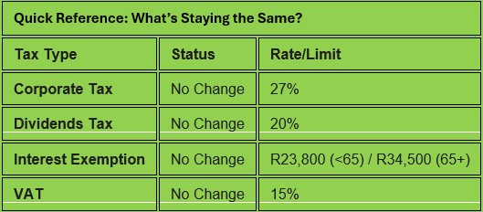 - Small Business Owners: If you’re over 55 and selling your business, the exclusion on capital gains is being bumped up to R2.7 million (from R1.8 million), provided the business’s market value doesn’t exceed R15 million.